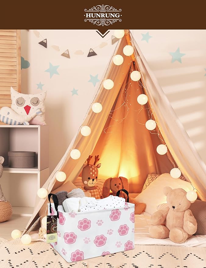 HUNRUNG Rectangle Storage Basket Cute Canvas Organizer Bin for Pet/Children Toys, Books, Clothes Perfect for Rooms/Playroom(REC-Pink Paw)