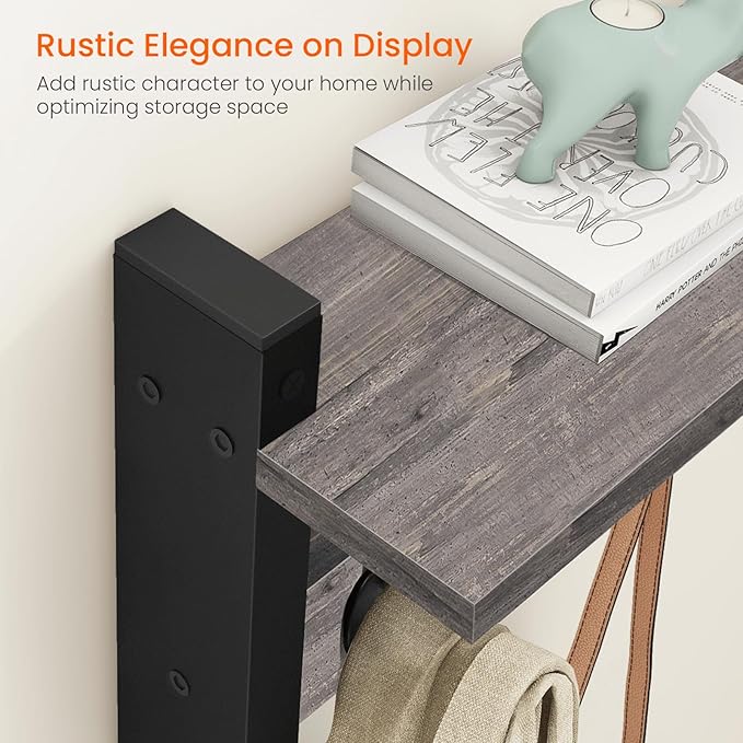 - 2-IN-1 DESIGN: The 4.52" deep floating shelf provides ample space for decorative items while featuring 5 dual metal hooks for practical hanging storage in your entryway or hallway. Showcase photo frames, a potted plant, or decor on the upper shelf