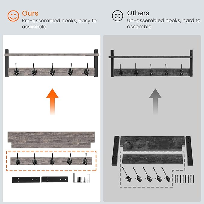 - QUICK AND EASY TO ASSEMBLE: Come with durable screws, anchors and easy-to-understand instruction, 5 hooks assembled on rail before package, pre- drilled holes for mounting brackets, the coat rack with shelf can be easily installed to the wall firmly
