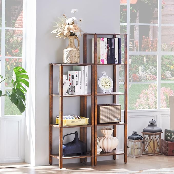 4 Tier Tall Wooden Bookshelf with Storage - Small Bookcase for Small Spaces, Shelf for Living Room, Office, Bedroom, Kitchen - Industrial Retro Brown Book Shelf