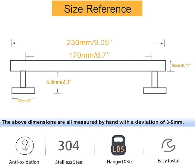- ▶【DIMENSIONS】: Overall length is 9" (230mm). The length of hanging space is 6.7" (170mm). Projection is 3.1" (78mm). This towel bar can be used in kitchens, baths, and laundry rooms, you can mount it to either side of your cabinet or closet door for storing at-use hand and dish towels.