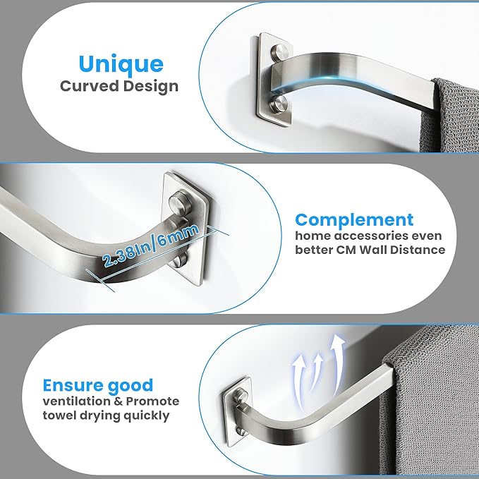 - 【MULTI-PURPOSE】Smooth curved design with a simple and elegant appearance, perfect for bathroom, kitchen, bedroom, laundry room, patio, luxury hotel and spa. Not only can be use as a towel bar for hanging towels and clothing, but also serves as a bath grab bar.