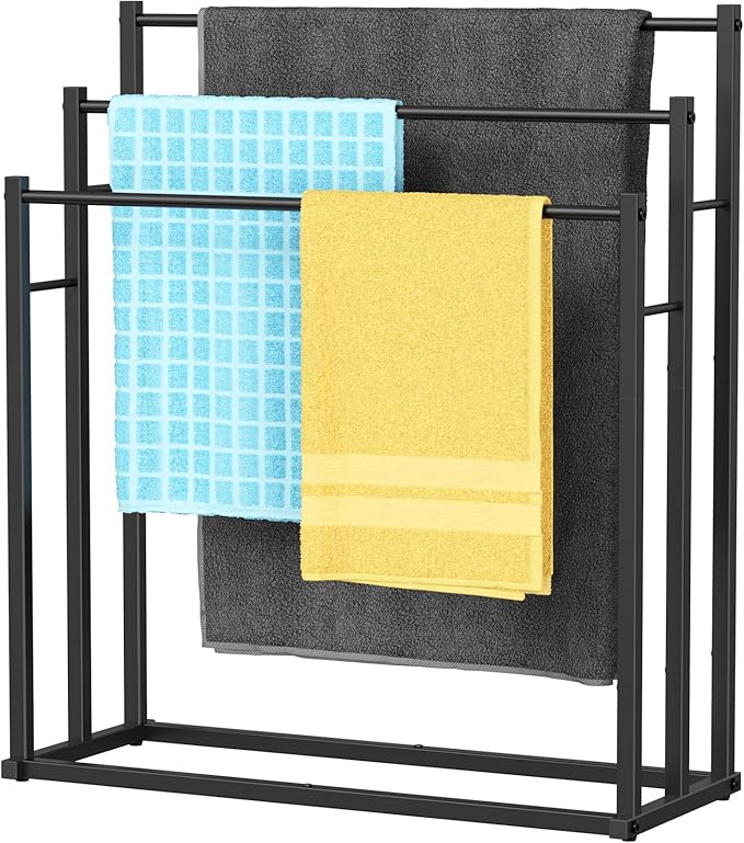 - 【3 Tier Free Standing】3 Towel bars are 27.4 inches, 31.3inches, 35.2 inches, from low to high, and the oversized bath towel will not touch the floor to keep the towel clean and hygienic. Spacious ventilation helps to quickly dry bath towels, suitable for bathroom, laundry room, bedroom and poolside.