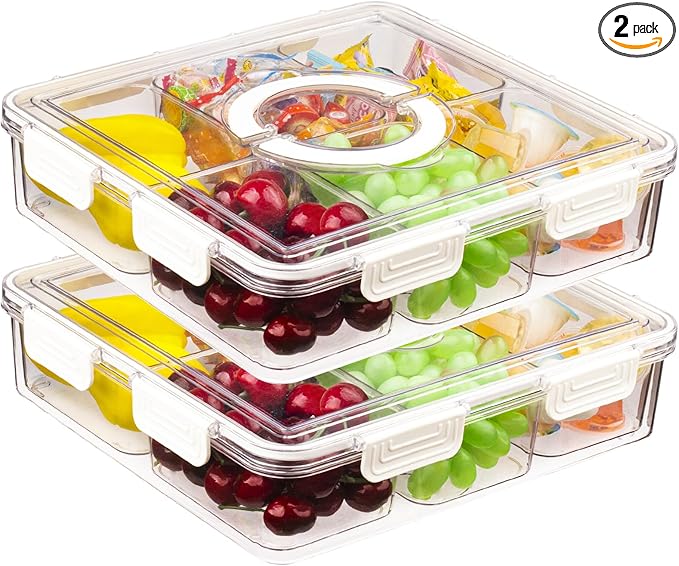 2PCS Divided Serving Tray with Lid & Handle, 6 Compartment Removable Snack Box, Kitchen Organizers and Storage, Snackle Box Container, BPA-Free Fruit Storage Container for Berry, Snack, Candy, Nuts…