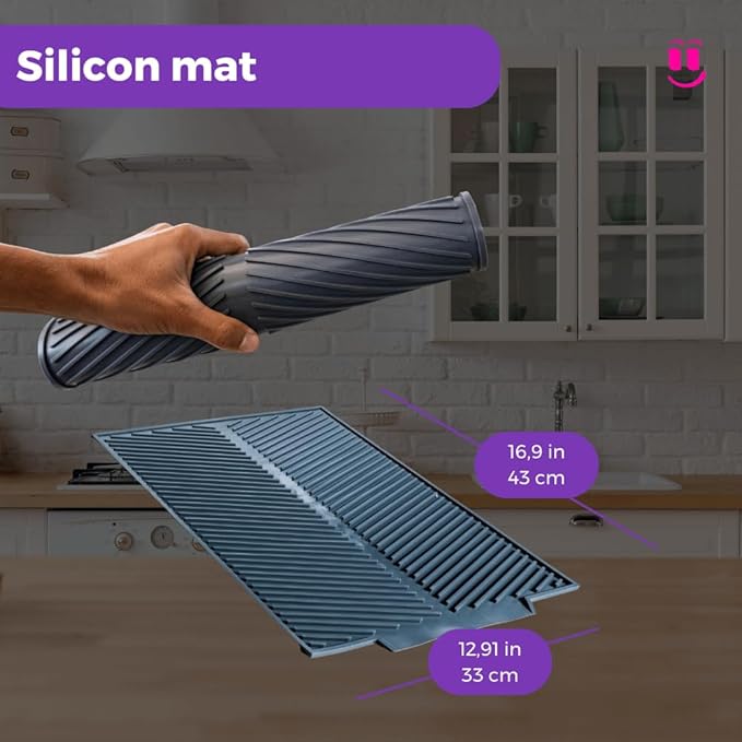- MEASURES: *Roll-up drying mat: (Retracted 11,8in | 28.9cm) (Expanded 20,8in | 52,8cm) *Expandable dish rack: (W: 5,1 in | 13cm) x (H: 2,9in | 7,5cm) x (L: 3,5in | 9cm) folded: 33in | unfolded 84cm *Silicone Mat: (W: 12,91 in | 33cm x (L: 19,9in / 43cm)