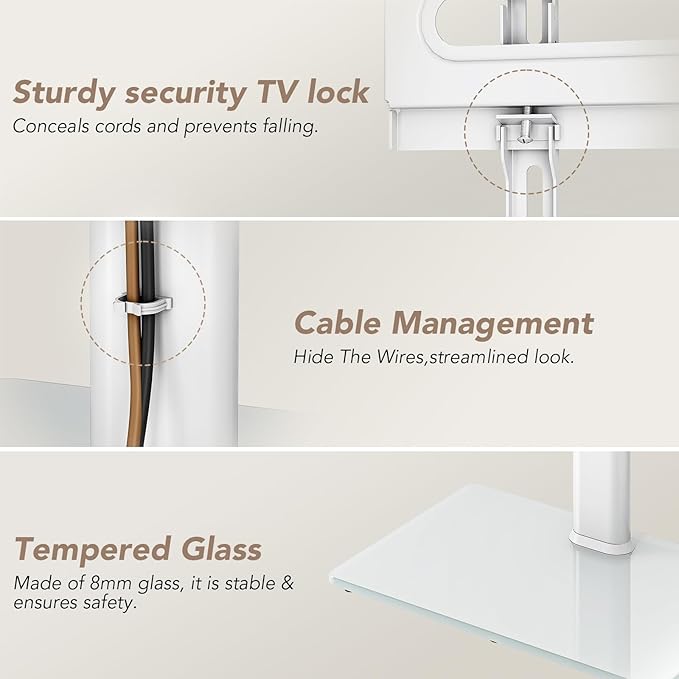 - SMART DESIGN ☞ This smart floor TV stand comes with 10mm solid tempered glass base that connects to a solid steel pillar which provides stable support for your TV that creates a modern look for your audio video equipment, it can hold up to 77lbs