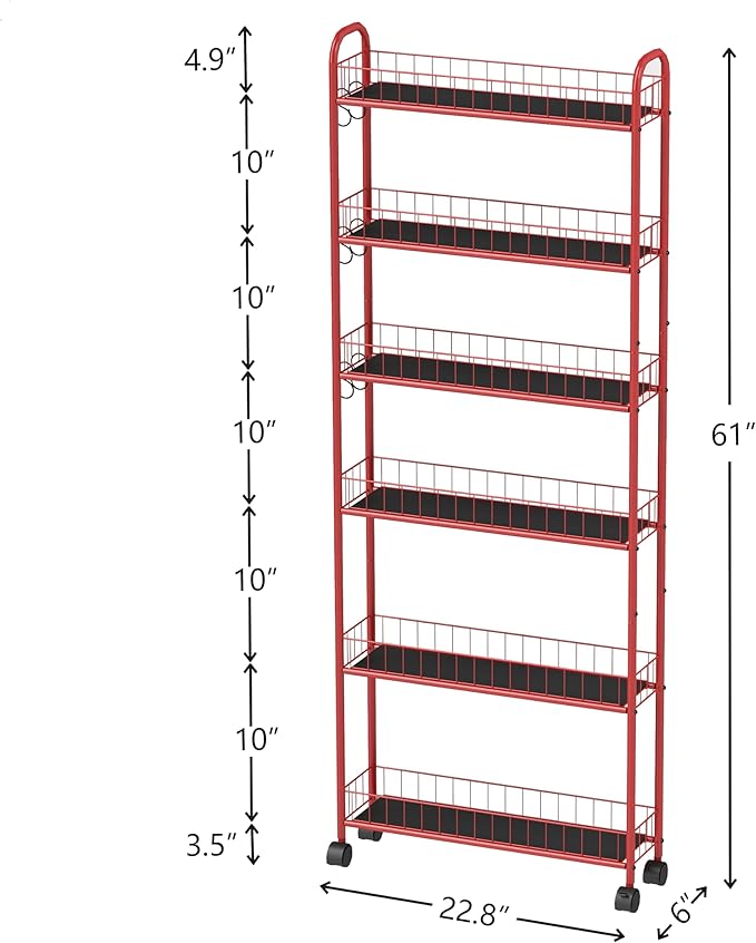 - Optimal Size: Skinny shelf for small spaces measure 10 “D x 22.8‘W x 61’H, 6‘D x 22.8’W x 61'H. Thinner and taller, can hold a lot of things and are great for keeping your space tidy. There exists 6 tiers of compartments to help you organize your unused items and meet all your storage needs.