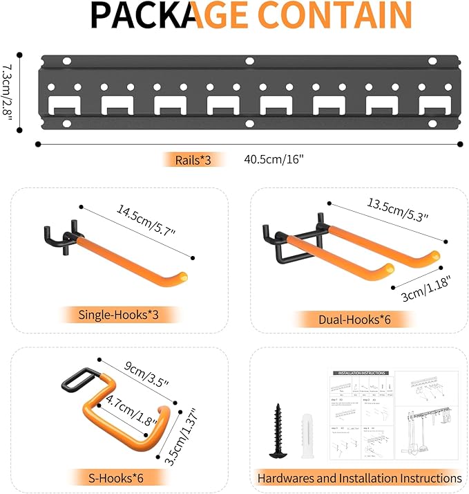 - Adjustable Pegboard Design: This garage storage and organization rack is 48 inches long. Equipped with 3 rails and 15 hooks (Includes 6 x dual-hooks, 3 x single-hooks and 6 S-hooks). The rails of this yard tool rack are with Pegboard design, which allow you to adjust the hooks easily to meet your actual needs