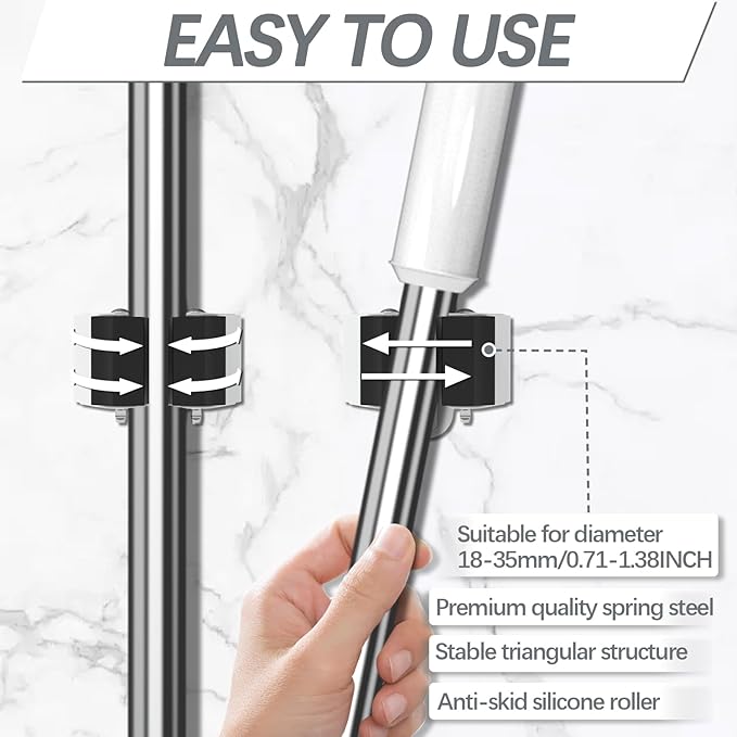 - SUPERB STABLE - Can be attached individually and placed individually.with fit diameter range from 18-35 mm(0.7-1.45 in) by lifting the mop handle, the broom wall mount rolling balls automatically adjust to each broom handle's thickness and grips it securely. silicone grip keeps tool handles away from slipping & scratching,broom holder can grip up to 8-10 pounds cleaning tools and garden tools