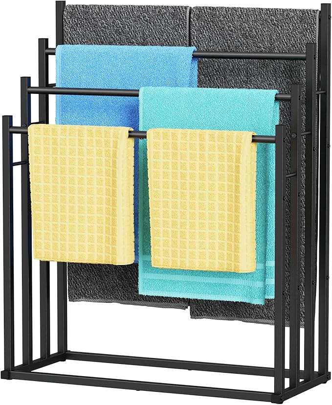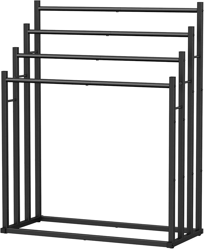 - 【4 Tier Free Standing】4 Towel bars are 27.2 inches, 31.1inches, 35.1 inches, 38.9inches, from low to high, and the oversized bath towel will not touch the floor to keep the towel clean and hygienic. Spacious ventilation helps to quickly dry bath towels, suitable for bathroom, laundry room, bedroom and poolside.