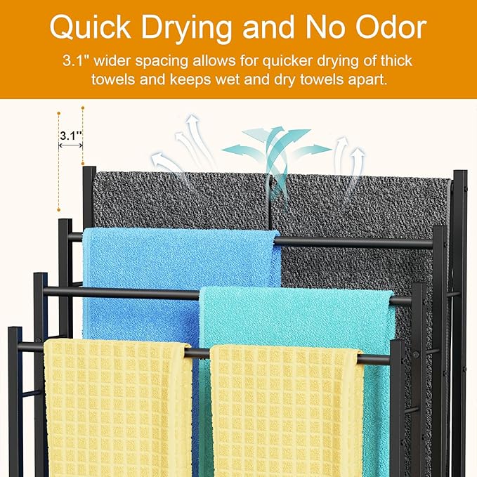 - 【Extra Widen Towel Stand】31.5 inches wide, allowing you to spread your towels out fully without the need for folding. The 3.1 inch gap between the two bars ensures ample air circulation, which promotes rapid drying even for thick towels and helps prevent the development of unpleasant odors.