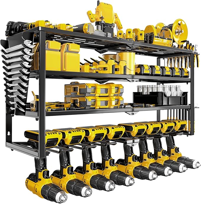- MAXIMIZE YOUR SPACE:This power tool organizer boasts a robust 4-tier design, with the bottom tier specifically engineered to hold up to 8 cordless drills securely. The top three tiers and side compartments are designed to accommodate a wide range of heavy-duty tools and smaller accessories, ensuring all your tools have a dedicated place