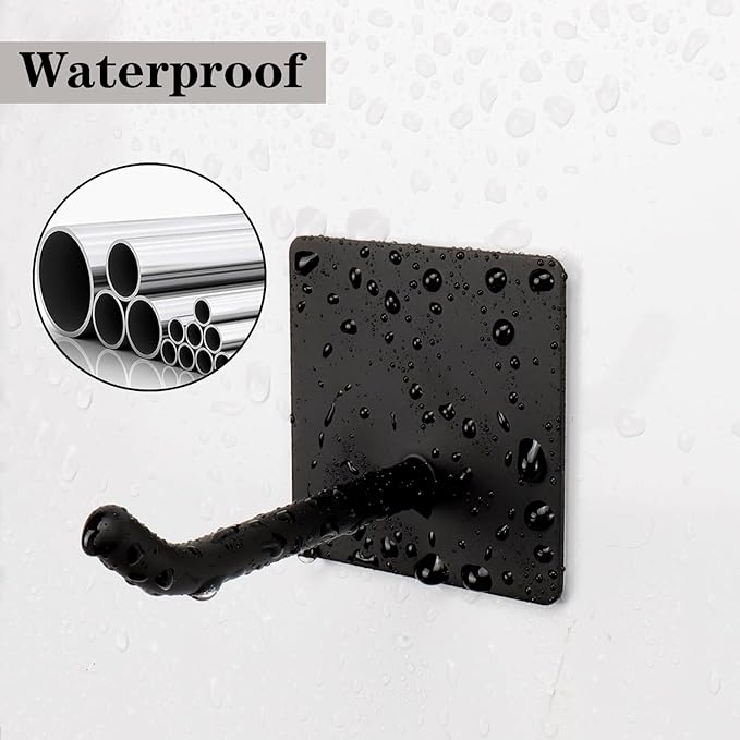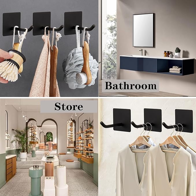 Bath Towel Hooks - 6 Pack Long Self Adhesive Coat/Clothes Hooks, No Drilling Strong Sticky Hooks, Heavy Duty 304 Stainless Steel Shower Wall Hook for Bathroom Kitchen Bedroom(Matte Black)