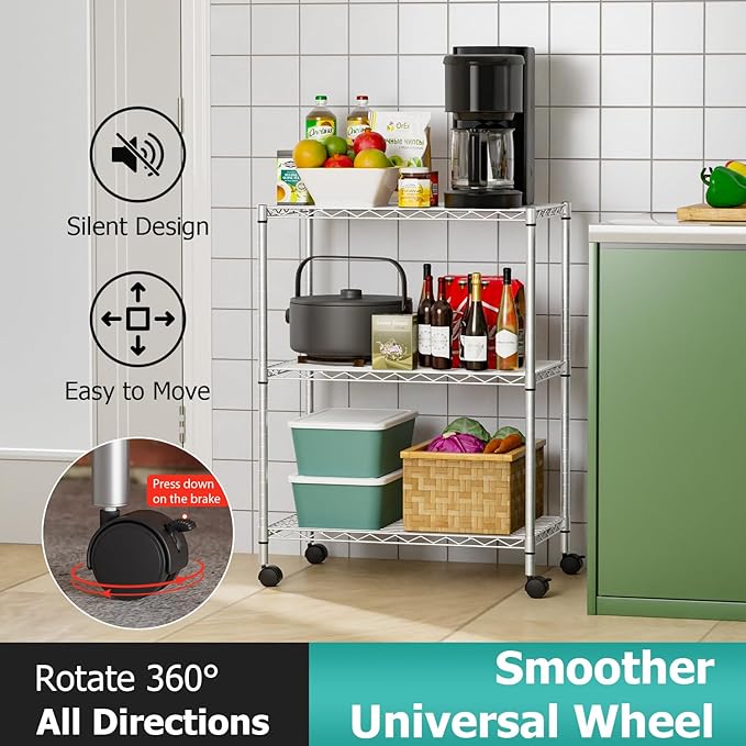 FDW 3-Shelf Adjustable,Storage Shelves Wire Shelving Shelving Unit Metal Shelves Storage Shelf with Wheels,13" D x 23" W x 31" H,Chrome
