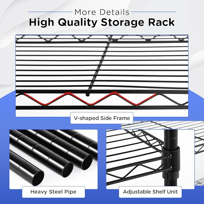 - Sturdy and Durable: This shelving unit is constructed from high-quality V-shaped steel wire for maximum durability and stability. The storage rack is rust-proof and scratch-resistant finish ensures the shelf stays in great condition over time. Our storage shelves are built to last, providing you with a long-lasting storage solution for any environment.