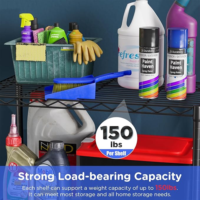 - High Weight Capacity: Our wire shelving supports a total weight of up to 450 lbs, with each tier holding up to 150 lbs. The storage shelves are reliable and strong enough to hold heavy items without bending or warping. Ideal for storing bulkier items, ensuring your storage needs are met with ease.