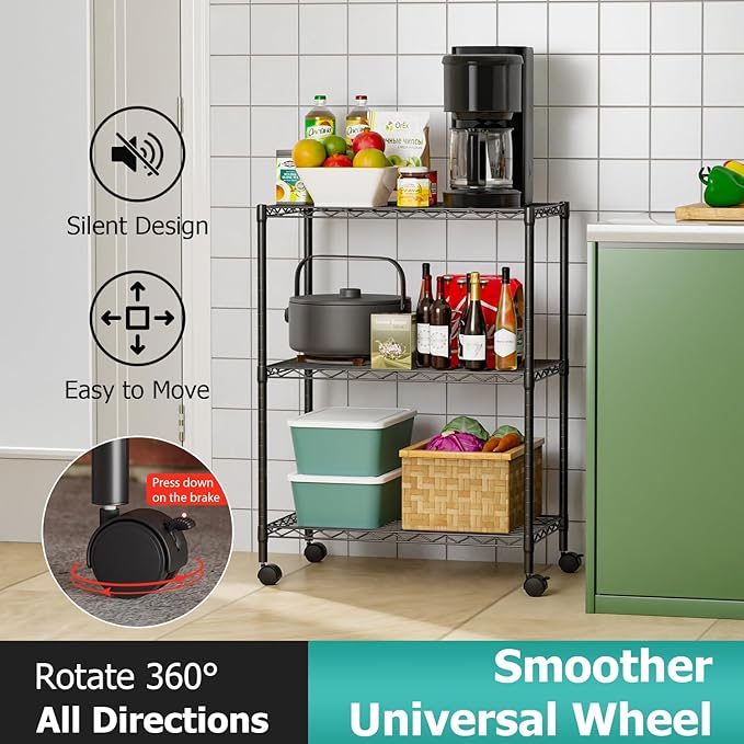 FDW 3-Shelf Adjustable,Storage Shelves Wire Shelving Shelving Unit Metal Shelves Storage Shelf with Wheels,13" D x 23" W x 31" H,Black