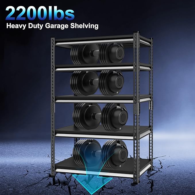 - 【Large Loads Capacity】 Made of all industrial grade metal, this 5-tier heavy-duty garage shelving holds 440 lbs each shelf and 2200 lbs in total. You're free to pile on tools, supplies, or whatever you need in your garage or warehouse