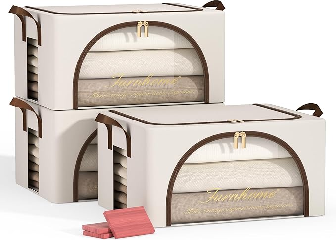 Furnhome 3 pack Clothes Storage Bins with metal Frame, sweater storage for closet, Stackable Storage bins for clothes, Foldable Clothing Storage bins with Cedar Blocks& Windows&Zippers|24L-Light Grey