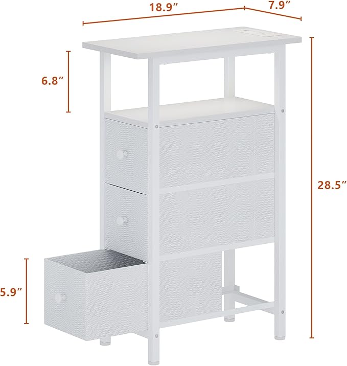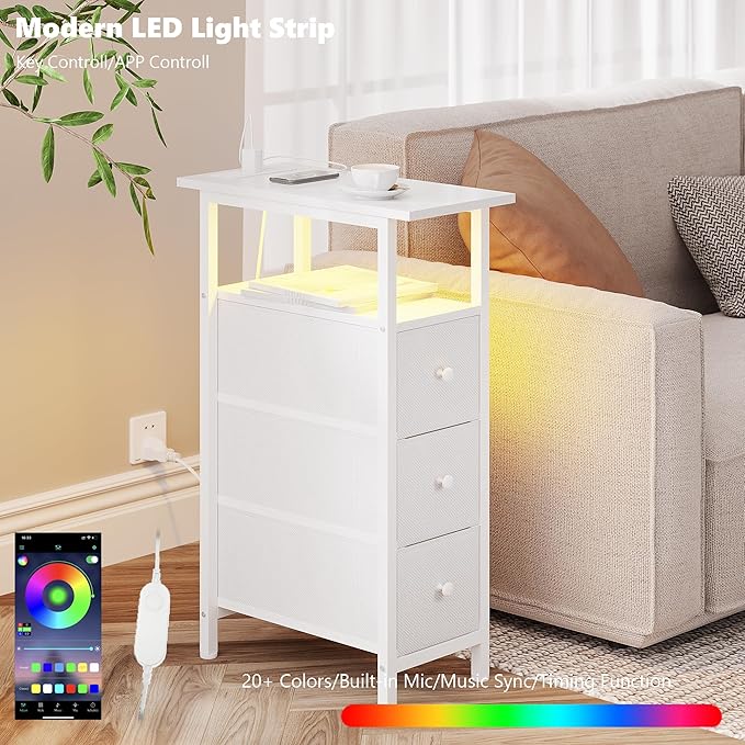 End Table with Charging Station, Narrow Side Table with 3 Fabric Drawers, Skinny Nightstand with LED Light, Slim Bedside Table for Bedroom, Living Room, Small Spaces, White