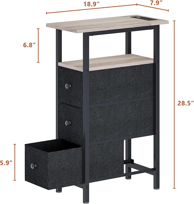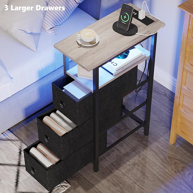 End Table with Charging Station, Narrow Side Table with 3 Fabric Drawers, Skinny Nightstand with LED Light, Slim Bedside Table for Bedroom, Living Room, Small Spaces, Greige and Black