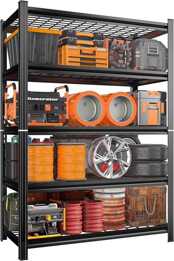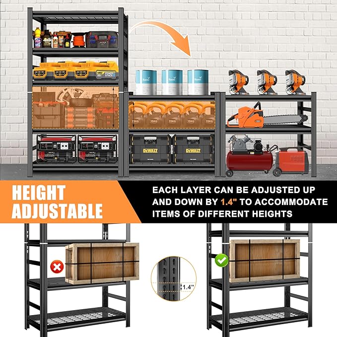 - 【Extremely Sturdy & Durable Garage Shelving】Constructed from high-strength premium cold-rolled steel with advanced powder-coated technology, this metal garage shelving unit resists rust, oxidation, and wear. The industrial-grade coating not only enhances aesthetics but also boosts durability, making it a heavy duty metal garage shelving solution for long-term use