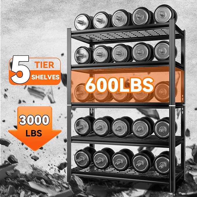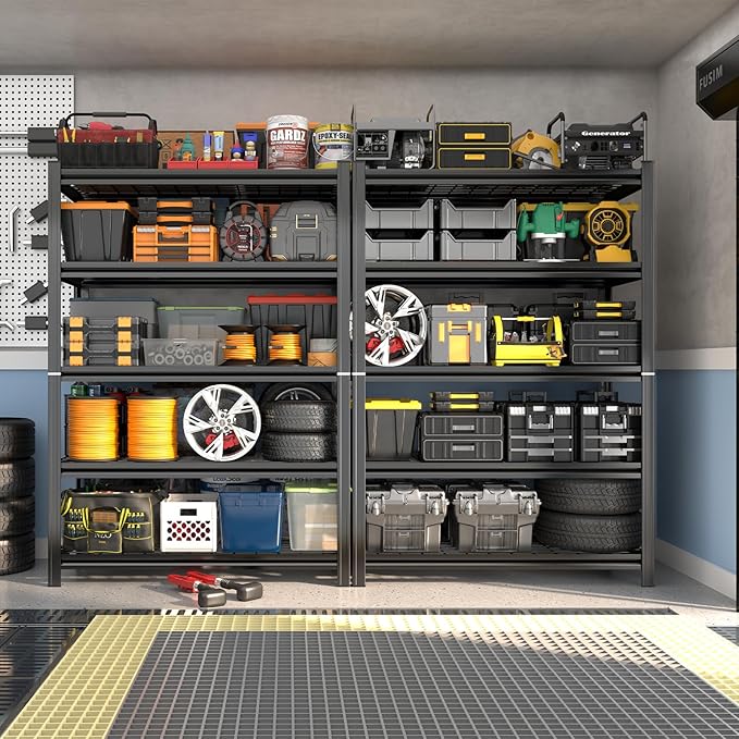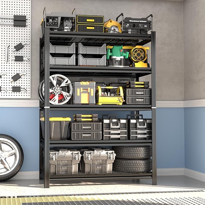 - 【Extremely Sturdy & Durable Garage Shelving】Constructed from high-strength premium cold-rolled steel with advanced powder-coated technology, this metal shelving unit resists rust, oxidation, and wear. The industrial-grade coating not only enhances aesthetics but also boosts durability, making it a heavy-duty shelving solution for long-term use