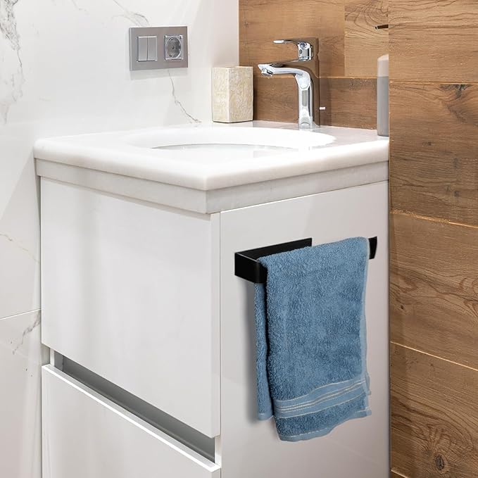 - Widely used towel rack - 8-inch towel bar is the perfect size for any space. Adhesive towel holder can be used next to bathroom sink or kitchen sink, bathtubs, wooden cabinet surfaces, glass surfaces, or other areas. You can use this adhesive towel bar as a and towel holder for bathroom wall, bathroom towel rack, towel holder for kitchen cabinet, towel holder over door, towel holder wall mount, tissue rack, etc