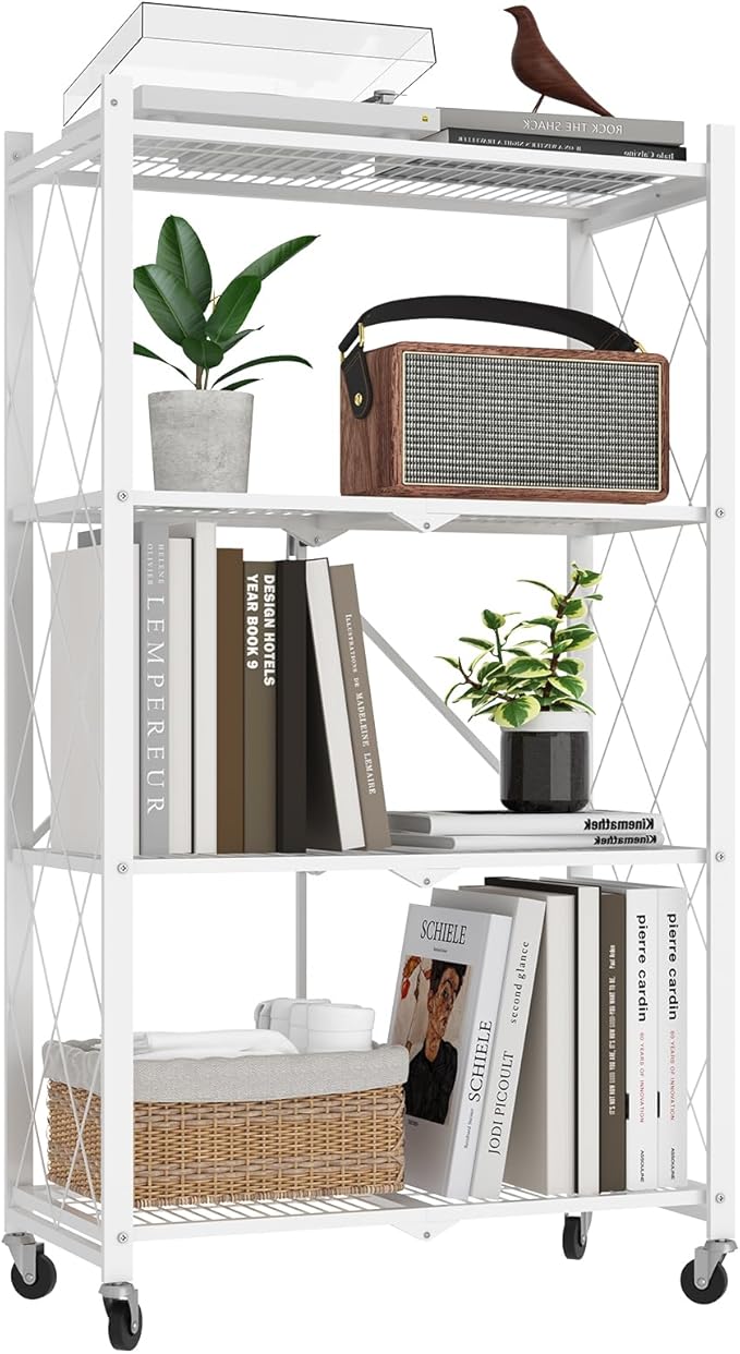 50" H 4 Tier Foldable Storage Shelf with Wheels, Folding Shelving Loads 400 LBS, Metal Steel Garage Shelves, Rolling Standing Utility Rack for Kitchen, Pantry, Office, White