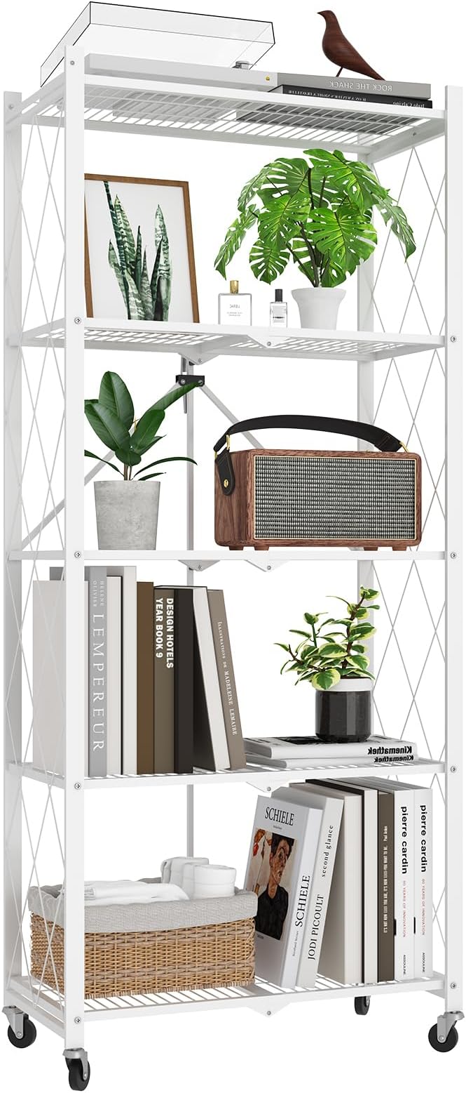 64" H 5 Tier Foldable Storage Shelf with Wheels, Folding Shelving Loads 500 LBS, Metal Steel Garage Shelves, Rolling Standing Utility Rack for Kitchen, Pantry, Office, White