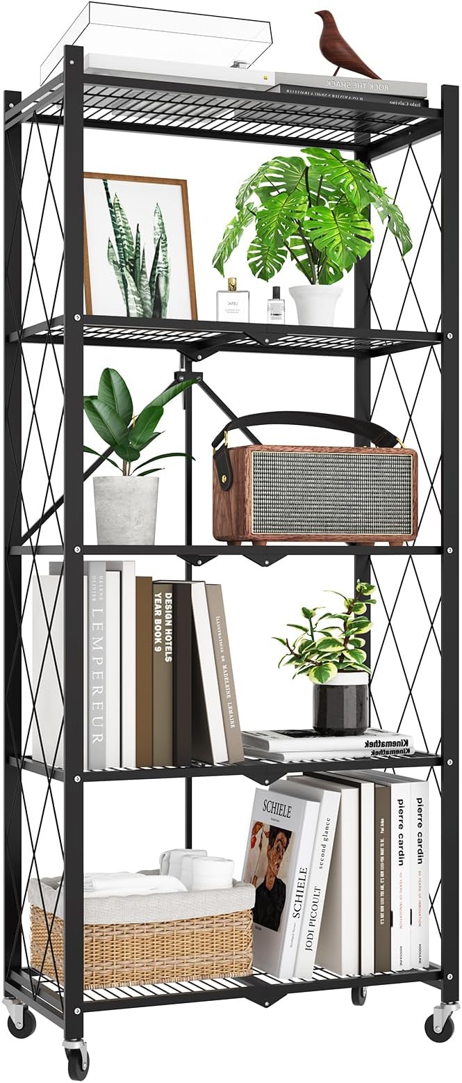 64" H 5 Tier Foldable Storage Shelf with Wheels, Folding Shelving Loads 500 LBS, Metal Steel Garage Shelves, Rolling Standing Utility Rack for Kitchen, Pantry, Office, Black