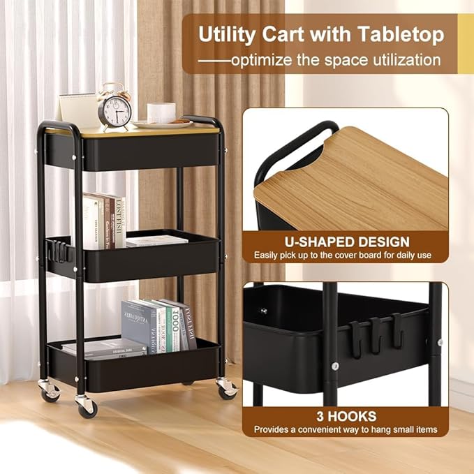 - STURDY AND LARGE CAPACITY: This rolling cart organizer with wooden tabletop is made of a highly resistant metal and coated with powder to enhance protection against rust, water and corrosion. 3 tier metal baskets create extra storage for your daily life.