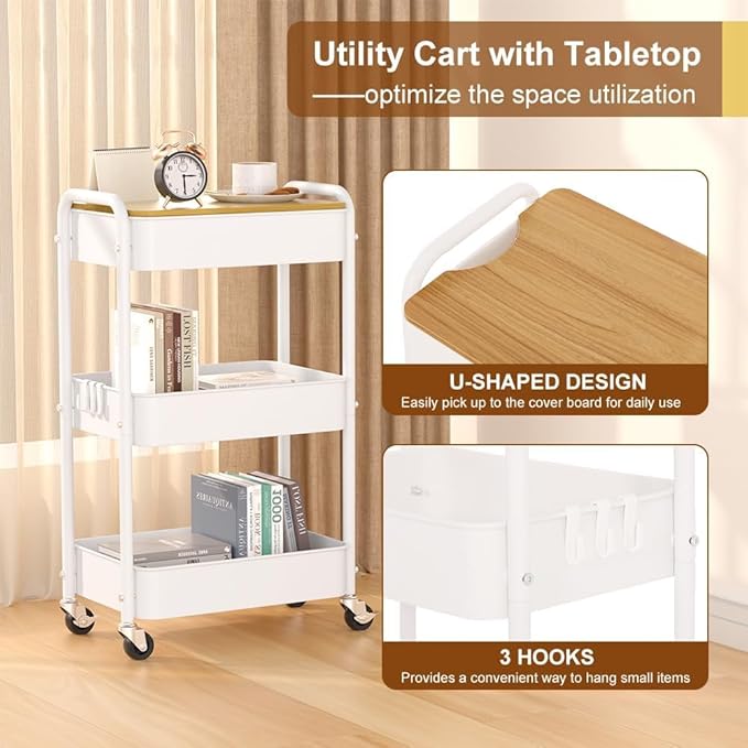 - STURDY AND LARGE CAPACITY: This rolling cart organizer with wooden tabletop is made of a highly resistant metal and coated with powder to enhance protection against rust, water and corrosion. 3 tier metal baskets create extra storage for your daily life.