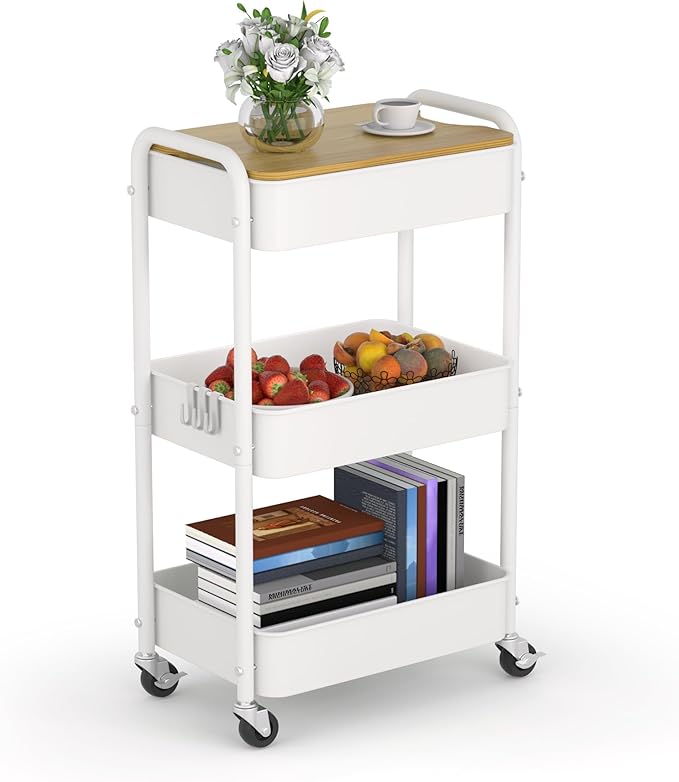 3 Tier Metal Utility Cart, Rolling Storage Cart with Wooden Tabletop, Metal Organizer Cart with Lockable Wheels for Office, Bedroom, Kitchen and Living Room (White)