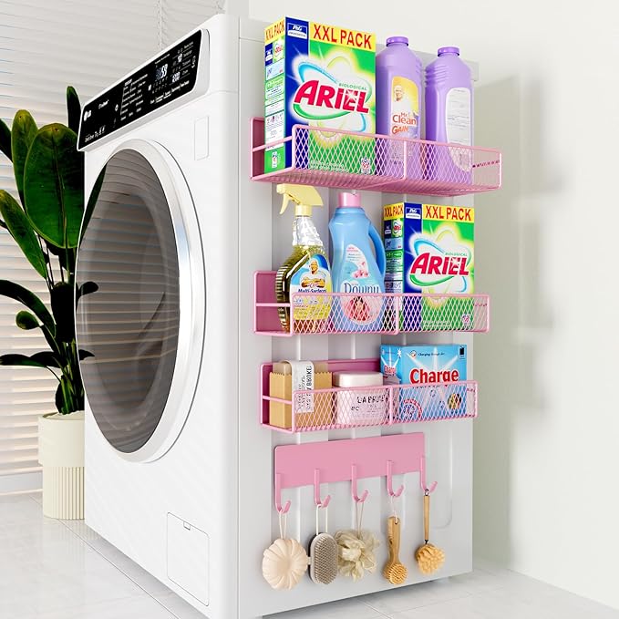 4 Pack Magnetic Shelves for Washing Machine, Heavy-Duty Magnetic Laundry Organizer with Hooks, Washing Machine Shelf for Refrigerator, Metal Storage Baskets, Closet & Laundry Room Organization (Pink)