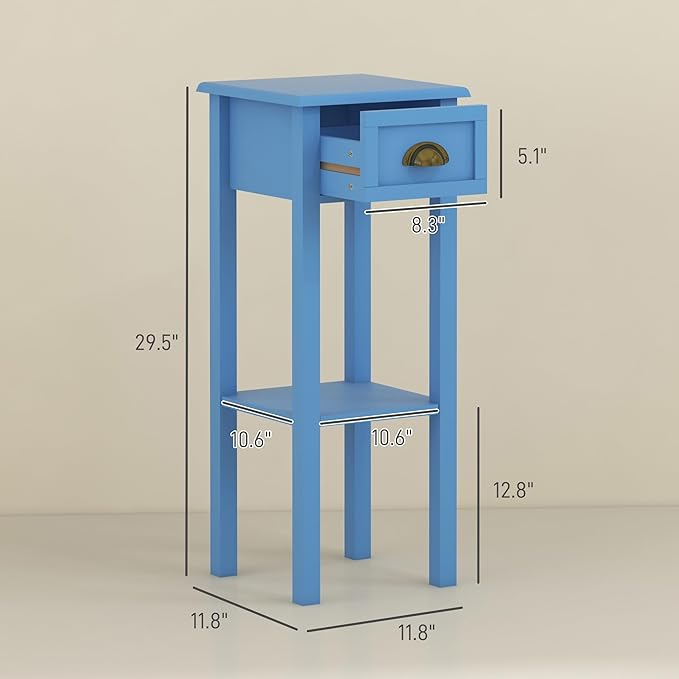 HOMCOM 2-Tier Side Table with Drawer, Narrow End Table with Bottom Shelf, for Living Room, Set of 1, Light Blue