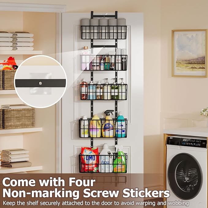 - [Multifunctional Storage]Our hanging door organizer with 5 baskets of different sizes and 7 hooks. In the laundry room, it can organise a wide range of laundry detergents, cleaners and various hygiene products;In the bathroom,it can store bathing products, cosmetics, towels; In the bedroom, it can store dolls, bags and baby products; In the kitchen, it can store your spices, snacks, bottles. Assembled dimensions: 5.5“D x 16"W x 59.8"H.