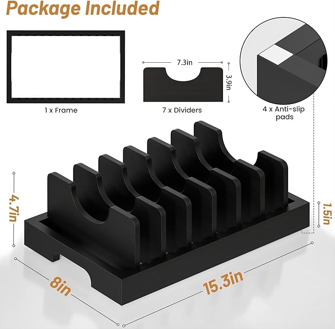 - ššØš¦š¦š¢šššš ššØ šš„š¢š¦š¢š§ššš šš„š®šššš« -This pot and pan organiser has 7 dividers and 13 slots for quick and easy installation. There are anti-slip pads on the bottom to prevent sliding on the counter. Place removable dividers into slots to fit different sizes of pots and pans depths. The unique semicircular groove design next to the handle makes it easy to carry.