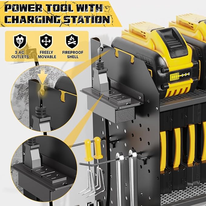 - 【HIGHLIGHT DESIGN】Our power tool organizer wall mount has a user-friendly 3-plug and plug-in row with 3 jacks that can be mounted on either side of the shelf. With an output power of 125V/12A/1500W, it delivers reliable power to your equipment. It also includes a 6.56-ft power cord for extra convenience.