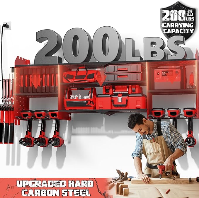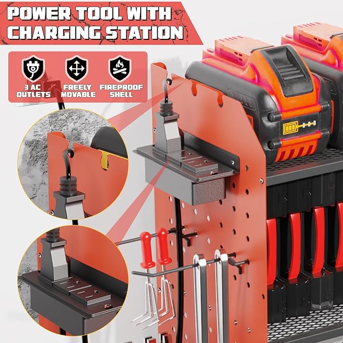 - 【HIGHLIGHT DESIGN】Our power tool organizer wall mount has a user-friendly 3-plug and plug-in row with 3 jacks that can be mounted on either side of the shelf. With an output power of 125V/12A/1500W, it delivers reliable power to your equipment. It also includes a 6.56-ft power cord for extra convenience.