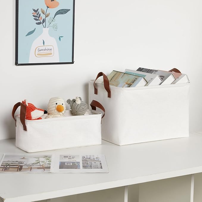 - Easy to Carry:The rectangle basket comes with a pair of PU carrying handles. Tear-resistant carrying handles make it easy to move around when it's full of items, making it perfect for shelves, closet storage, changing seasons, and moving houses.