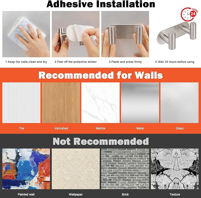 - EASY TO INSTALL: Sticky double hooks don't require drilling, suitable surfaces are wood, marble, tile, glass, plastic, metal; Don't use on stucco, wallpaper, brick and concrete walls, otherwise it will easily damage the wall surface