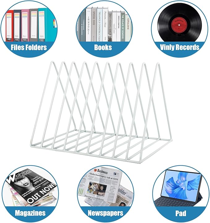 EASEPRES Vinyl Record Holder Storage, 9 Slot Metal Magazine Book Album Display Rack, Stylish Triangle Desktop File Sorter Organizer for Home Office, White