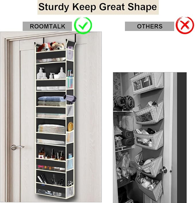 - 【EASY TO HANG】We'r affirmative that the size and the shape of this back door hanging storage are exactly what your family needs, 2 large exclusive steel hooks are adjustable better for your standard home size doors, It hangs supports the front bins decent not to sag or tilt forward.