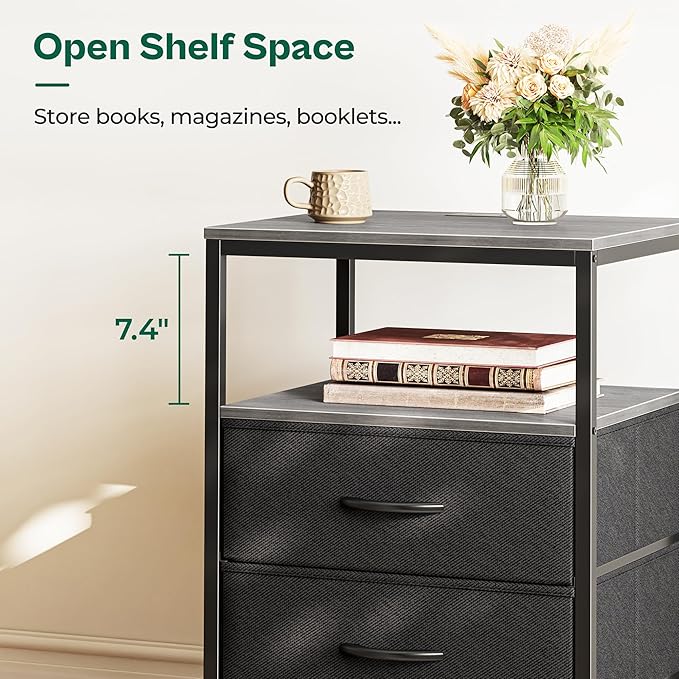 - 【2 Drawer Nightstand】2 fabric drawers and an open shelf on the side table with storage offer lots of space to stash your bedside items, like books, devices, and remote... A tidier bedside space awaits