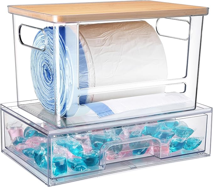 - MULTIFUNCTIONAL DESIGN: The Trash Bag Organizer Under Sink has a large front opening and a removable bamboo lid for easy access to items. Trash bag has handles on both sides for easy movement. laundry pod holder has a pull-out design for easy access to items