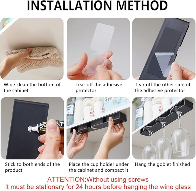 - Easy to Install: The wine glass rack is equipped with self-adhesive adhesive, Punch-free,easy to install,Due to the different materials of cabinets, Suitable for different installation environments:bar glass holder,wine cabinet,kitchen cabinet,under shelf in receiption room etc.