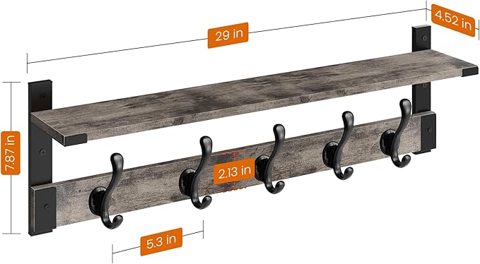 - AMPLE 29-INCH STORAGE: This wall mounted coat rack designs with a 29" length for efficient use of space, providing ample storage for coats, keys and towels; The wall hooks with shelf remains a practical and space-saving solution for entryway, bedroom, bathroom