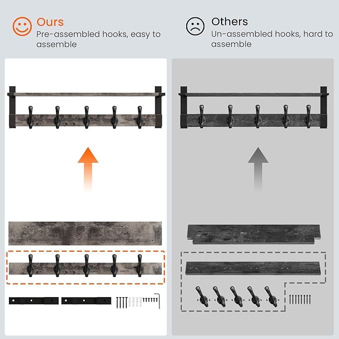 - EASY INSTALLATION: Our entryway shelf with hooks comes with all necessary hardware, 5 coat hooks assembled on rail before package, pre- drilled holes for mounting brackets, making setup hassle-free for quick and secure mounting on your wall