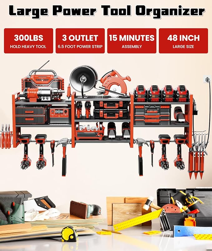 - 【EXCELLENT MATERIAL】This power tool organizer is made of thickened, heavy-duty steel metal with a durable black powder coat finish to prevent rust, it will stay in brand new condition whether it's in a wet basement or dusty and humid garage, ensuring that the tool rack will have a lifetime of service life and become a reliable companion in your workplace.
